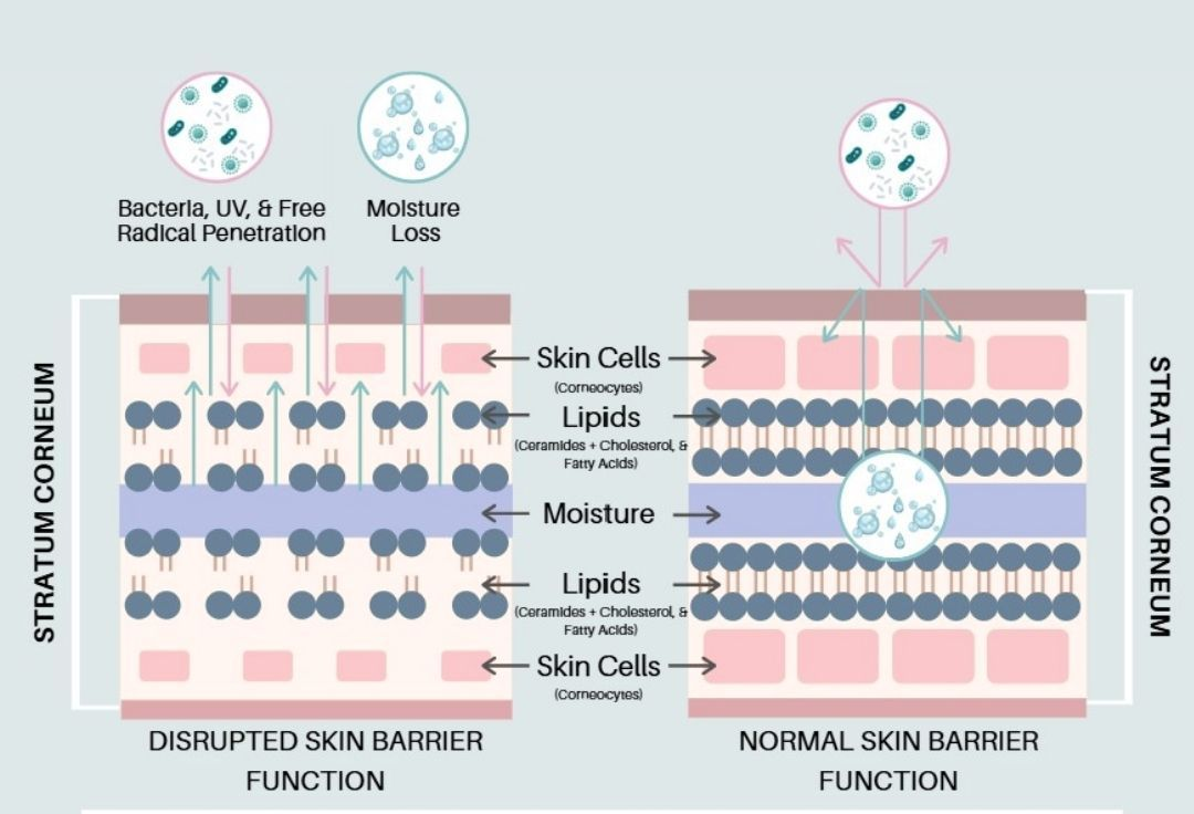 This structure helps keep moisture in and irritants out, protecting the skin from environmental stress, bacteria, and inflammation.